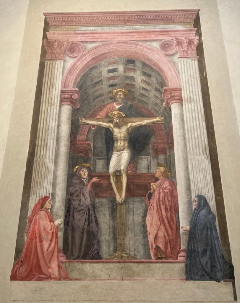 Forgive me if you already are familiar with this stuff. I think the coolest thing I’ve seen so far is Masaccio’s Holy Trinity, a fresco in the Basilica of Santa Maria Novella. In 1428 CE, it is the first time an artist used Brunelleschi’s concept of linear perspective to represent a 3-dimensional space in a 2-dimensional painting. In addition,  the composition is a kind of a motif used in many paintings- Christ on the cross in front, God the Father behind (sometimes seated on a throne), and the Holy Spirit represented as a dove near Christ’s head (see the first two paintings below). In case you (like me) need some remedial art history, here are a couple of websites explaining how Brunelleschi developed the concept of linear perspective and how Masaccio used it in the Holy Trinity: https://smarthistory.org/masaccio-holy-trinity/ and https://www.khanacademy.org/humanities/renaissance-reformation/early-renaissance1/beginners-renaissance-florence/v/linear-perspective-brunelleschi-s-experiement