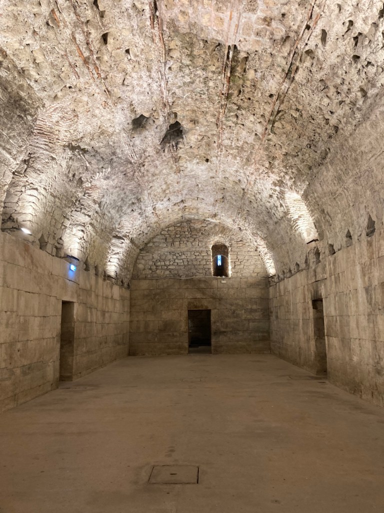 The property sloped down to the water. To keep the above ground part of the entire palace on the same elevation, the Romans had to build an elaborate and substantial “basement” to keep the residential section level with the administration section. These chambers were primarily used for storage. There might have been areas devoted to worship of the gods. There also might have been a dining room.