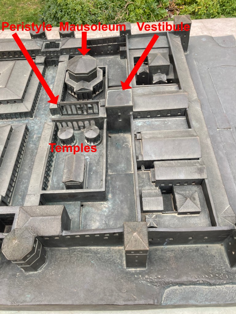 The palace was divided into 2 parts. His residence occupied the seaside half. It comprised a residential section, a temple section, and a mausoleum. The inland half contained barracks for his palace guard and offices for whatever administrative responsibilities are incumbent on a retired Roman emperor.